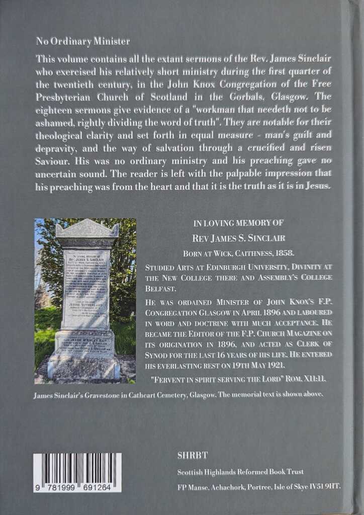 This volume contains all the extant sermons of the Rev. James Sinclair who exercised his relatively short ministry during the first quarter of the twentieth century, in the John Knox Congregation of the Free Presbyterian Church of Scotland in the Gorbals, Glasgow. The eighteen sermons give evidence of a “workman that needeth not to be ashamed, rightly dividing the word of truth”. They are notable for their theological clarity and set forth in equal measure – man’s guilt and depravity, and the way of salvation through a crucified and risen Saviour. His was no ordinary ministry and his preaching gave no uncertain sound. The reader is left with the palpable impression that his preaching was from the heart and that it is the truth as it is in Jesus.